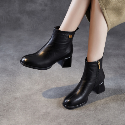 圆头粗跟短靴女25冬季新款牛皮短靴中跟侧拉链靴复古百搭短筒棉