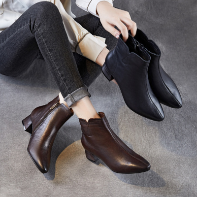 尖头粗跟拉链时装单靴女秋冬新气质优雅踝靴真皮复古休闲短靴