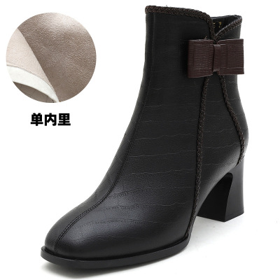 秋冬季新款粗跟中筒靴子女加绒棉鞋中跟尖头小短靴复古真皮鞋
