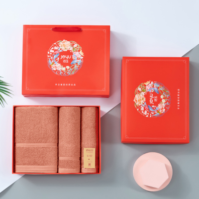 洁玉 似锦开门红云舒2毛巾1浴巾三套巾礼盒 J2701-C 珊瑚红*3条