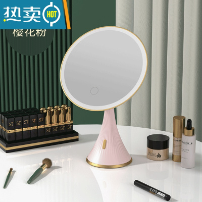 敬平高清化妆镜台式led灯家用小型学生宿舍桌面发光带灯美妆梳妆镜子便携式用镜 奢金款樱花粉[三色光+高清大镜面]