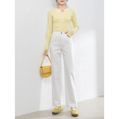 米白色牛仔直筒裤女秋季高腰宽松弹力柔软九分阔腿裤8131