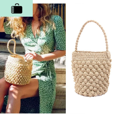 2019新款水桶编包编织包女沙滩度假ins欧美时尚单肩手提沙滩包NEW LAKE 米白色手提豆豆米白色女士单肩包