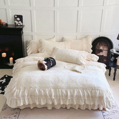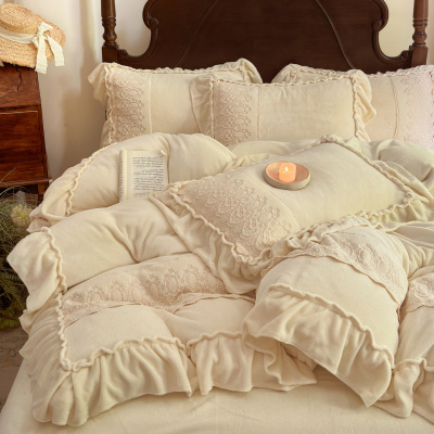 冬季法式花奶油风牛奶绒四件套加厚珊瑚绒镂空蕾丝被套公主床裙