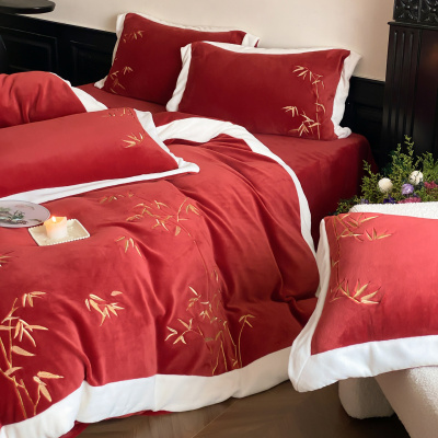 冬季牛奶绒280g加厚刺绣四件套婚庆红色珊瑚绒结婚保暖床单被套