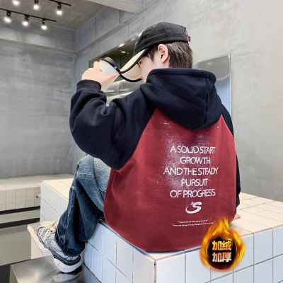 男童加绒卫衣一体绒新款加厚男孩秋冬装衣服儿童拼色连帽上衣
