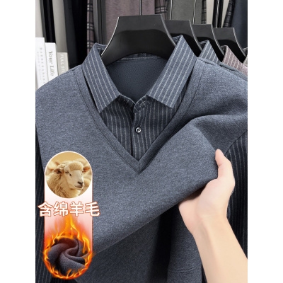 男士衬衫领加绒T恤商务休闲假两件加厚打底衫一体绒保暖爸爸上衣