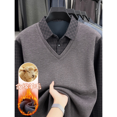 男士加绒打底衫冬季加厚保暖T恤简约假两件一体绒中年翻领保暖衣
