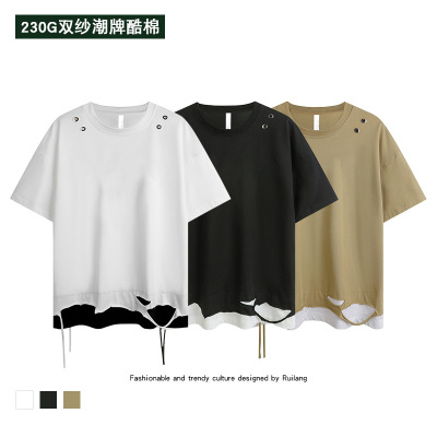 高街假两件下摆破洞短袖T恤男230g重磅夏季潮牌嘻哈情侣装半截袖