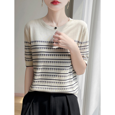 夏季新款莱赛尔冰丝条纹针织衫短袖女宽松显瘦中年妈妈装薄款上衣