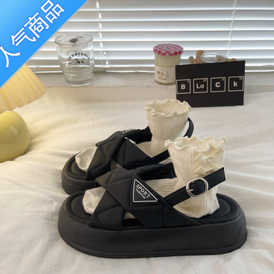 SUNTEK黑色厚底交叉凉鞋女夏季外穿2023年新款踩屎感松糕网红罗马鞋