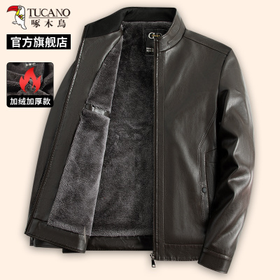 啄木鸟新款男士皮夹克中老年爸爸装冬季加绒加厚休闲外套上衣服C