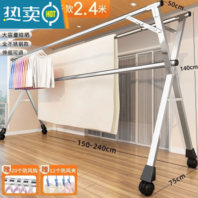 敬平不锈钢晾衣架落地结实可伸缩移动折叠晒被小型阳台双杆式室新 加高升级特粗款2.4?长衣不落地?滑轮更便捷 大
