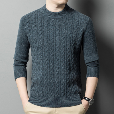 秋冬男士羊毛衫扭花圆领加厚套头毛衣青年针织打底羊毛衫男纯色