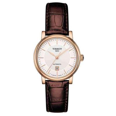 天梭(TISSOT)瑞士自动机械女表30mm不锈钢表壳真皮表带防水50米日期显示