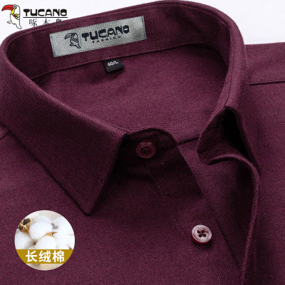 啄木鸟纯棉衬衫男长袖休闲磨毛厚款酒红纯色本命年爸爸全棉衬衣男