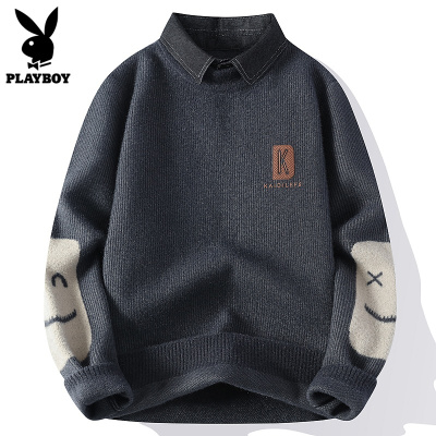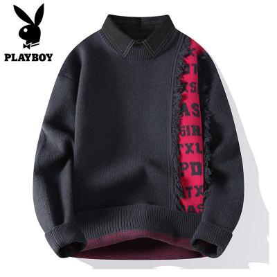 花花公子假两件毛衣男款冬季保暖潮流针织衬衫领拼色休闲内搭男士