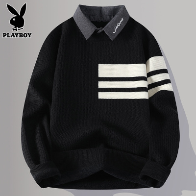 花花公子假两件毛衣男款冬季潮流衬衫领条纹刺绣内搭配针织衫男士
