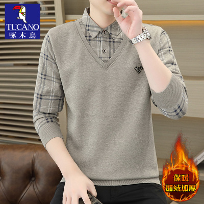 啄木鸟加绒加厚毛衣男士假两件2024新款冬季衬衫领保暖针织打底衫