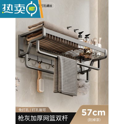 敬平1434枪灰毛巾架卫生间置物架壁挂浴室免打孔厕所洗手间浴巾架 太空铝枪灰固定网篮浴巾架双杆57CM浴室置物架