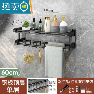 敬平卫生间置物架壁挂式浴室毛巾架不锈钢免打孔双层厕所洗漱架收纳架 [雅黑款]单层60cm(免打孔)送6钩浴室置物架
