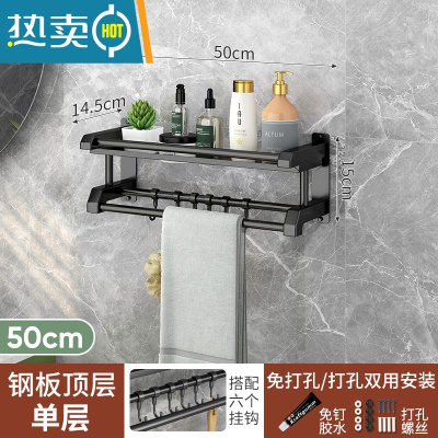 敬平卫生间置物架壁挂式浴室毛巾架不锈钢免打孔双层厕所洗漱架收纳架 [雅黑款]单层50cm(免打孔)送6钩浴室置物架