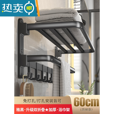 敬平黑色毛巾架免打孔太空铝卫生间置物架浴室双折叠浴巾架洗手间壁挂 2022升级[双折叠]加厚浴巾架60cm-9浴室置物架