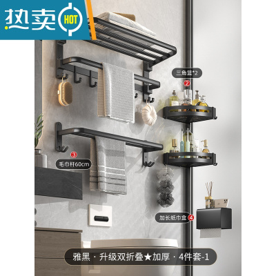敬平黑色毛巾架免打孔太空铝卫生间置物架浴室双折叠浴巾架洗手间壁挂 2022升级[双折叠]加厚浴巾架4件套-99浴室置物架