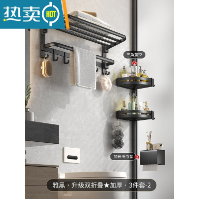敬平黑色毛巾架免打孔太空铝卫生间置物架浴室双折叠浴巾架洗手间壁挂 2022升级[双折叠]加厚浴巾架3件套-99浴室置物架