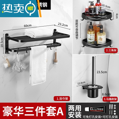 敬平卫生间毛巾架免打孔浴室厕所置物架壁挂轻奢收纳不锈钢黑色浴巾架 双层3件套A[雅黑款]浴室置物架