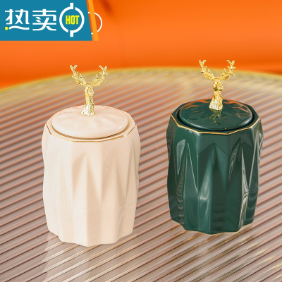 敬平轻奢风棉签收纳盒桌面个性陶瓷牙签收纳罐带盖桌面整理盒收纳罐子 白+绿