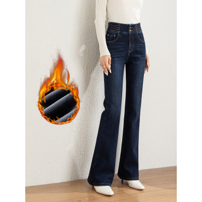 冬加绒加厚复古怀旧喇叭裤高腰刺绣微喇牛仔裤女