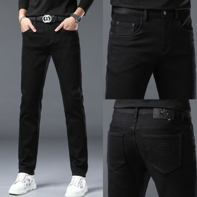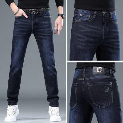 韩版男生加绒牛仔裤 可水洗品质舒适修身男裤 简约刺绣直筒裤男士