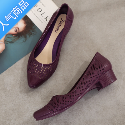 SUNTEK2021新款包头凉鞋女夏时尚外穿果冻塑料粗跟单鞋洞洞软底中跟浅口