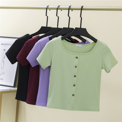 短款T恤紧身短袖女式新款漏肚脐打底衫设计感露锁骨高腰方领上衣