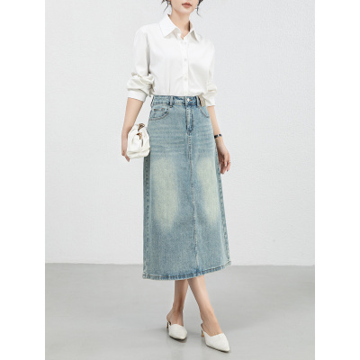 韩版复古中长牛仔裙女2025年春季大码高腰宽松A字半身裙