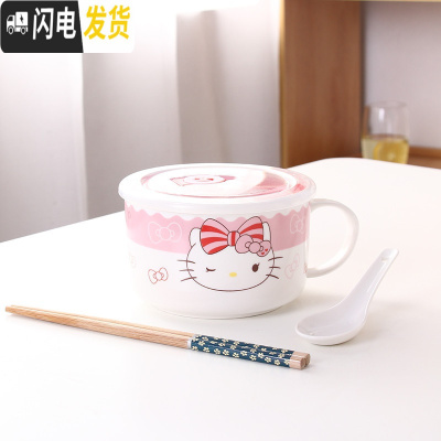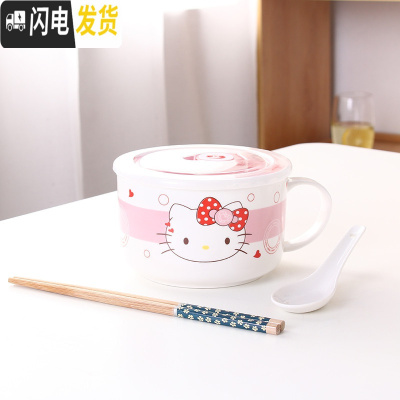 三维工匠陶瓷泡面碗带把带盖保鲜碗可爱饭盒学生便当盒大号方便面碗套装 KT猫(3)(送筷子勺子)
