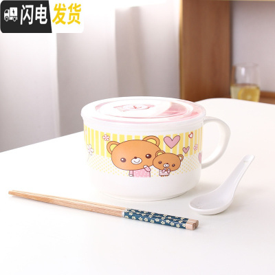 三维工匠陶瓷泡面碗带把带盖保鲜碗可爱饭盒学生便当盒大号方便面碗套装 可爱熊(4)送筷子勺子