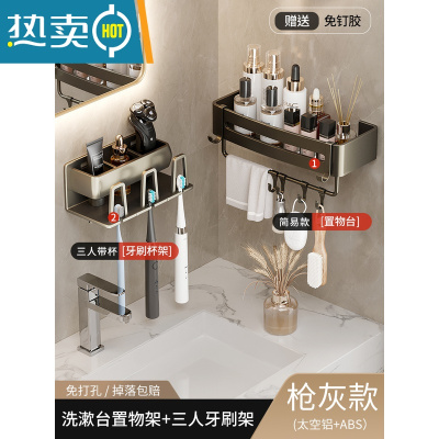 敬平枪灰浴室卫生间置物架牙刷架洗漱台厕所免打孔壁挂式梳子牙膏收纳 枪灰组合装❤牙刷架三人+方形置物架带杆浴室置物架