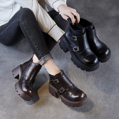 压花牛皮短靴皮带扣女靴秋冬英伦头层牛皮单靴加绒厚底机车靴