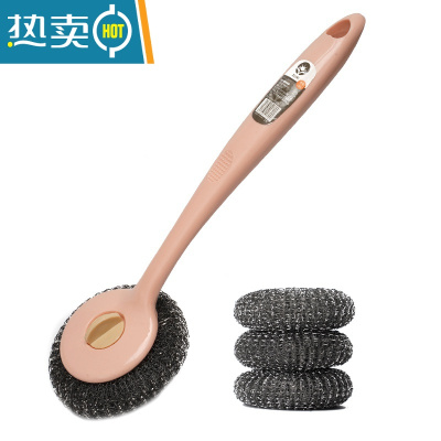 敬平厨房长柄洗锅刷洗碗锅刷锅器家用大号不锈钢钢丝球洗碗清洁刷子 [粉色]一把手柄+3个钢丝球