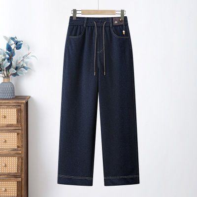 时尚休闲牛仔裤子40-60岁中年女大码宽松直筒长裤加绒保暖女士冬