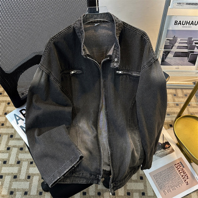 男装潮牌复古水洗拉链装饰美式小众机车牛仔夹克男春秋痞帅外套男