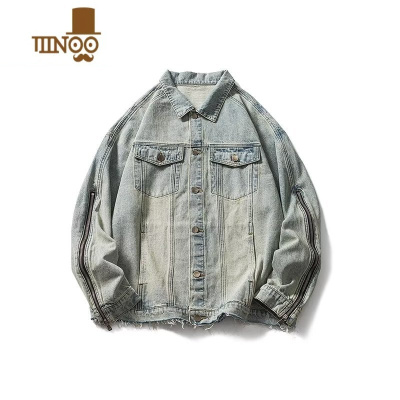 YANXUins美式高街破洞黄泥做旧水洗翻领牛仔夹克男复古潮牌拉链外套男
