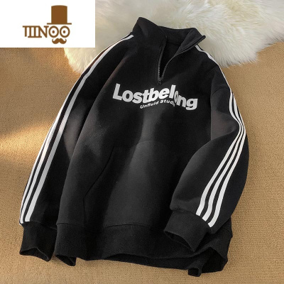 YANXU美式复古条纹立领卫衣男秋季新款宽松长袖半拉链外套高街潮牌