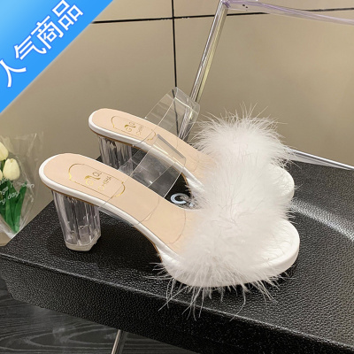 SUNTEK仙女风高跟毛毛拖鞋女夏外穿2023新款时尚百搭透明水晶粗跟凉拖鞋
