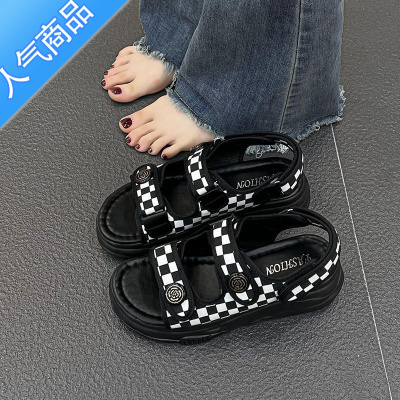 SUNTEK运动凉鞋女夏2023年新款棋盘格软底魔术贴学生网红厚底罗马沙滩鞋