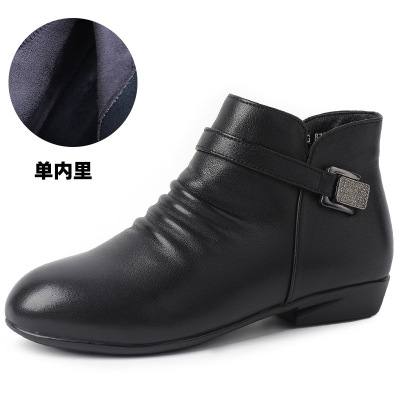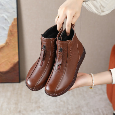 25秋冬新款简约舒适平底小圆头裸靴真皮女短靴防滑中老年妈妈棉鞋
