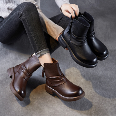 真皮女鞋25秋冬新款英伦复古侧拉链粗跟靴子马丁靴软底中跟女短靴