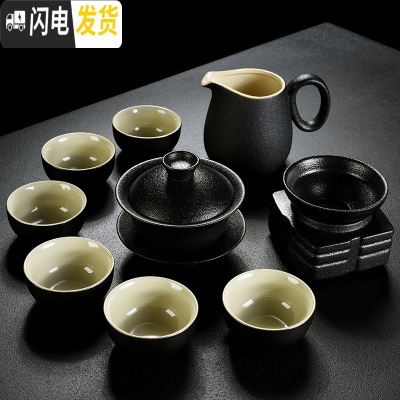 三维工匠黑陶粗陶功夫茶具套装家用简约实木竹茶盘复古茶壶盖碗茶杯 黑陶盖碗10头 10件